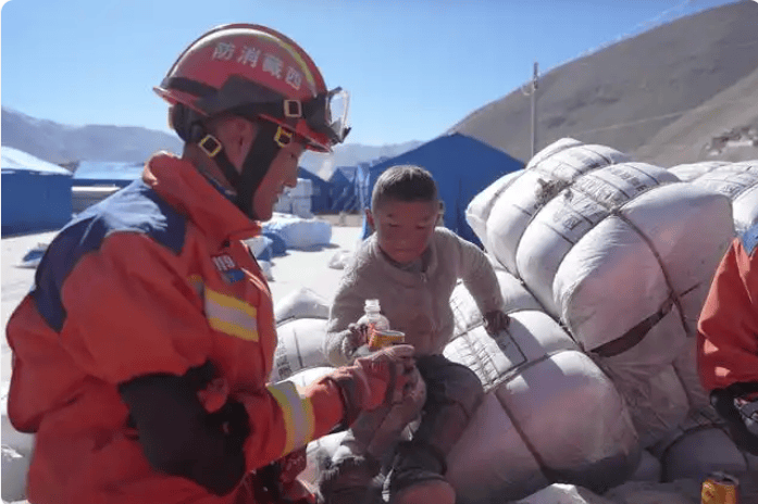 2025年1月8日,在塘仁村安置点,消防救援人员和小朋友互动(新华社记者 晋美多吉 摄)