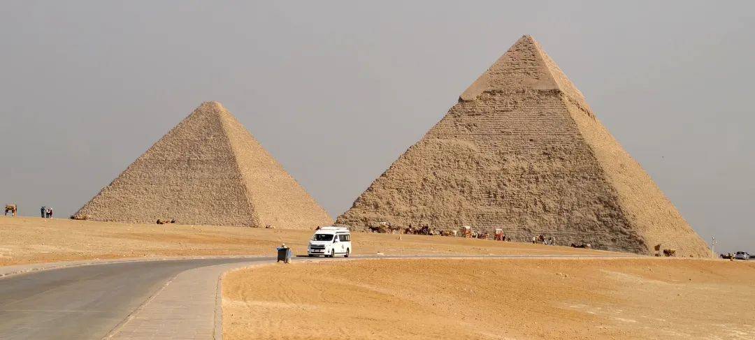 注:埃及有金字塔110座,散落于尼罗河西岸,是人类至今最大建筑群之一。其基座为正方形,四面则是四个相等的三角形(方锥体),侧影类似汉字的“金”字,故汉语称为金字塔。