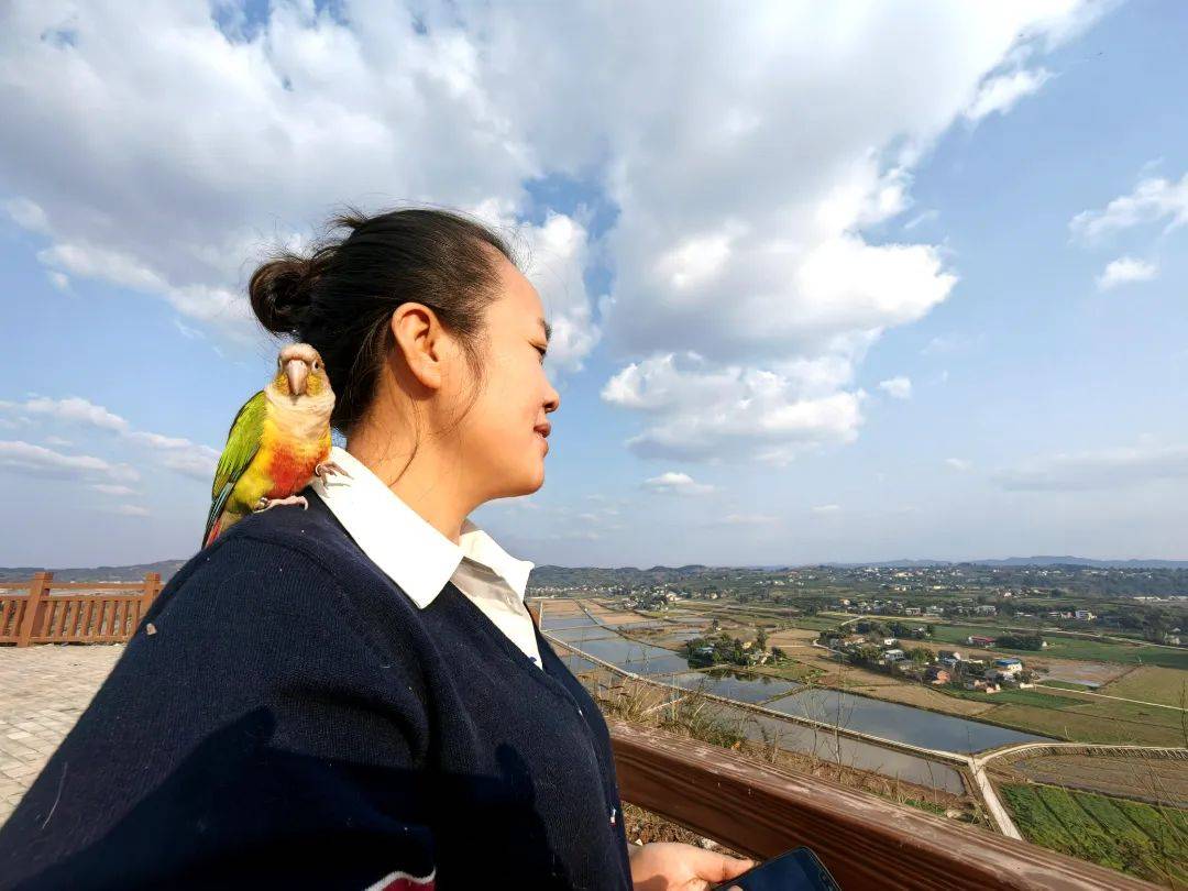 亲人、黏人、互动性强,成为幺鸡身上的标签。外出回家时,它会第一时间飞扑到我们头上、肩上,用它独特的方式给我们热烈的拥抱,那欢快的神情溢满整个屋子,让我们一天的疲惫都烟消云散;出门时,它总爱撵路,那难舍难分想撵路的样子,让我们心生温暖与不舍,但只要你对它说一声:“我去上班”,它便又乖乖地呆着目送你远去,像极了乖巧懂事的娃。每每出门散步,它会安静地待在我们肩上,那幅栖着翠绿流星的画面,成了街巷里流动的风景,也让它成为街上那个“最靓的仔”。每每此时,路人纷纷投来惊叹羡慕的目光,被问得最多的一句话是“你不怕它飞走啊?”见了生人,它也毫不怯场,会乖巧地和大家互动。每当我静心写稿时,它便会站在电脑屏幕上方,静静地看我敲击键盘,等候着我工作结束。在那些静谧的时光里,它是我最忠实的伙伴,陪伴我度过一个个思绪纷飞的时刻。这种鲜活的陪伴,让每个平凡日子都闪着细碎的光。