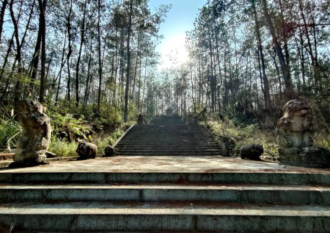 豁然展现在眼前的秦良玉墓,应该叫陵寝,因为秦良玉是封了侯的。整体看上去,这片墓地相当开阔、大气,有王侯气象。多层石阶从上至下滚开来,如同展开来的一条华贵的地毯。我拾级而上,如果没有数错的话,总共九层,每层九级台阶,共九九八十一个台阶,展现出一种深邃。
