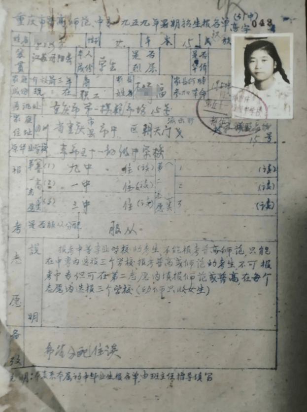 参加工作后,特别后来又到成都工作,开始利用业余闲暇时间收集一些带有历史印记的史料,其中就有一些中考史料。记得2020年曾在本地旧书摊淘得“重庆市普高、师范、中考一九五九年暑期招生报名单”。当时报考学校,得填写新中国成立前三年及现在的家庭成分,以及家长何时参加革命。报名单专门有一栏“志愿说明”:“报考中等专业学校的考生,不能报考普高、师范,只能在中专内选报三个学校;报考普高或师范的考生,不可报考中专,但可在第二志愿内填报师范或普高,在每个志愿内选报三个学校(幼师只收女生)”。