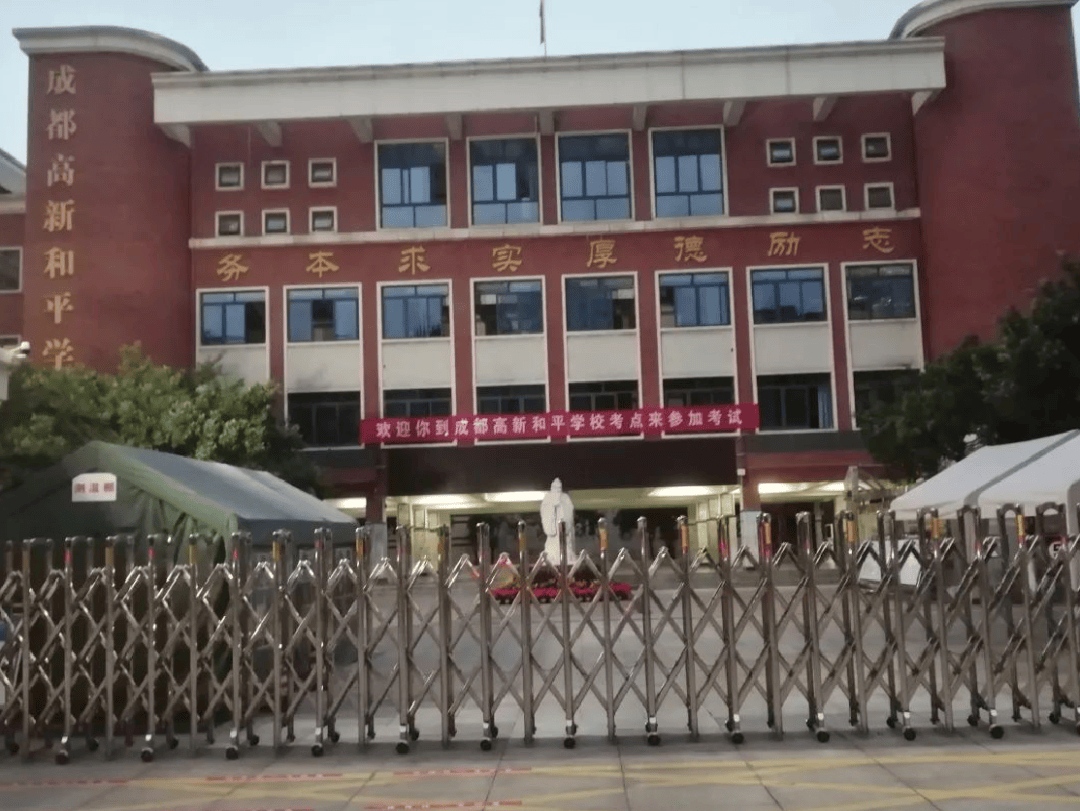 每到中考期间,手机都会收到中国移动发来的“服务提醒”短信,言及:“为了6月13日—14日成都市中考的顺利进行,期间考场区域周边可能会出现拨打电话频繁失败、通话声音突然出现断续、手机上网慢或者频繁掉线等现象,待考试结束后将恢复正常,请在附近居住的朋友们谅解。”收到此短信,才知又是一年中考了。无独有偶,期间晚上和爱人一起散步时,发现住家附近成都高新七初天和学校(原成都高新和平学校)即为成都中考考点之一,学校正门大楼前挂一横幅:“欢迎你到成都高新和平学校考点参加考试”。