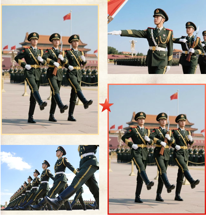 长街列阵,大国扬眉。旌旗猎猎,号角巍巍。忆昔烽烟蔽世,血染山河;而今铁甲生辉,光昭史碑。八十载春秋迭代,九万里鼓角重归。云开旭日,映金戈之灿灿;风卷宏声,震寰宇之雷雷。