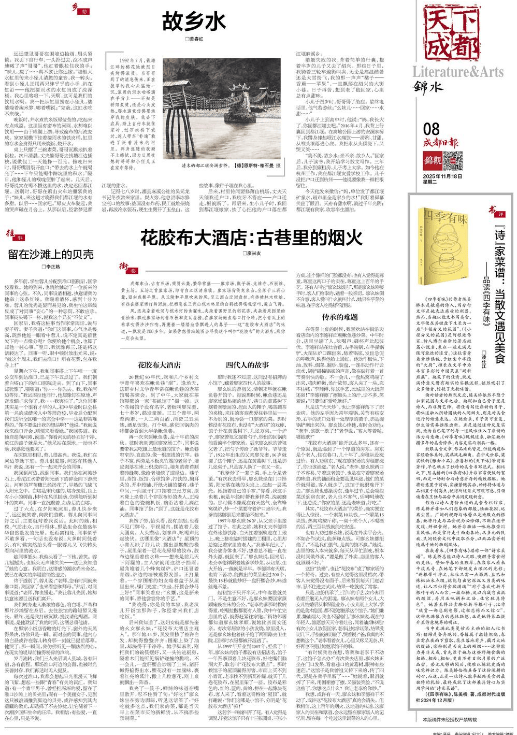 风,还夹杂着毗河与桤木河的鱼腥味,夹杂着田野里的稻花香,夹杂着果园里的青柚味,飘过廖家场的青石板和灰瓦屋檐,在廖家场鳅鱼巷口打个转,把小青瓦上的枯草吹得沙沙作响,再裹着一缕缕油香飘进人的鼻子——这“花胶布大酒店”的味道,一飘就是200多年。如果你想借助地图去寻找这个叫作“花胶布”的大酒店,那你一定会失望。