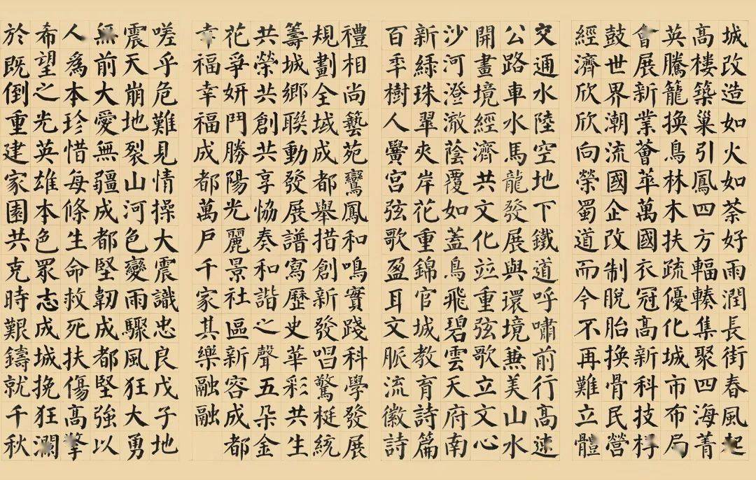 《成都赋》,由被誉为“三大词赋家”之一的何开四先生撰文,该文刻于天府广场石碑之上。 该赋从“远古洪荒”到“秦扫六合”,从“三国鼎立”到“自唐迄宋”,从“明末清初”到“改革开放”,道尽历史兴替,历数古今人文,铺陈辉煌文明。为过往“锦里繁华,千古流韵”而著述,为当下“阳光丽景,幸福成都”而放歌。该赋辞藻瑰丽,朗朗上口,读罢掩卷,成都大气恢弘的历史画卷如穿行时空隧道般历历在目,震撼人心,催人上进。可谓咏成都之名赋。