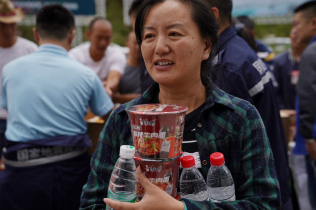 8月9日,在九寨沟黄龙机场,从九寨沟撤出的一名旅客领取方便面和水