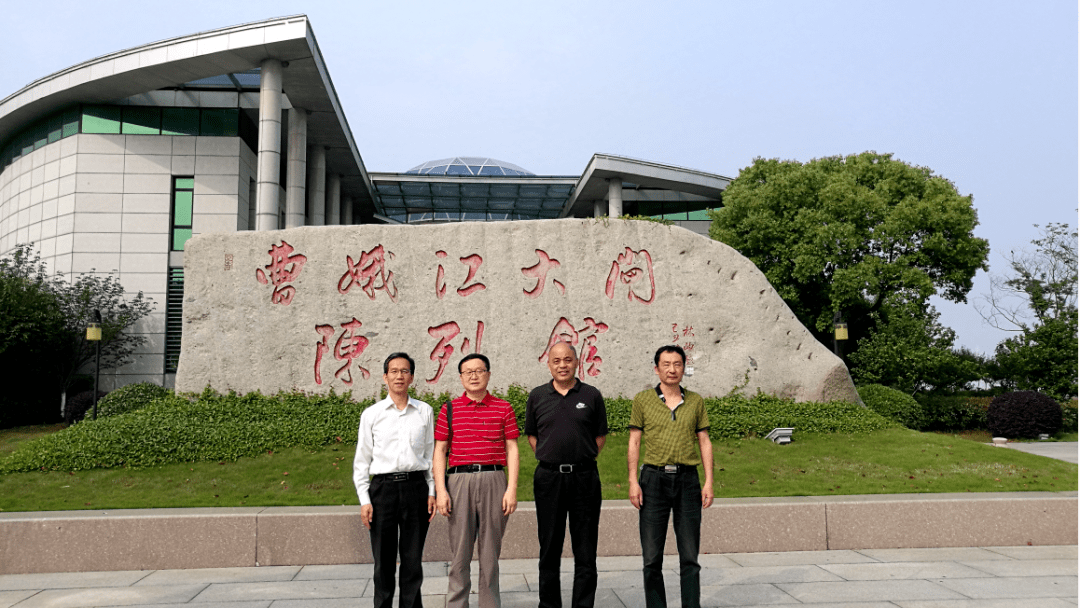 2020年5月,在曹娥江大闸考察,感受三江闸与时俱进的时代气息。左起:颜越虎(《浙江通志》副总纂)、汪毅(本文作者)、邱志荣(中国水利学会水利史研究会副会长、绍兴市鉴湖研究