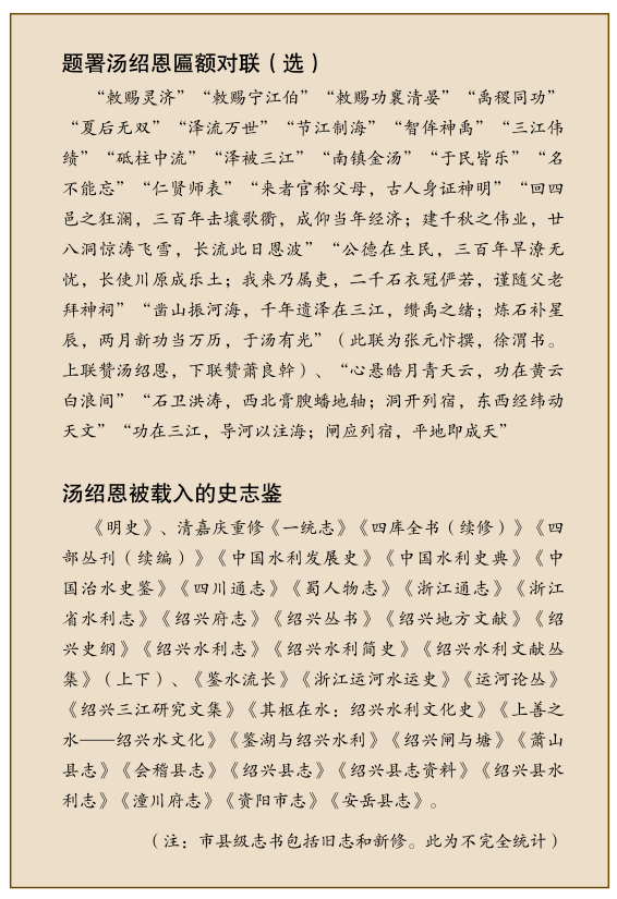 三江闸固然神奇,然而三江闸主持创建者汤绍恩本身也是一张名片,古籍文献中有一个评价体系,即关于他的《两川间气引》《功全禹迹引》《三代遗才引》《冰清蘖操引》等系列引和《永思集集》等记。他善治水,在绍兴治水历史上可与马臻相提并论,甚至不逊大禹(史籍中有若干表述);他有庙堂雅量,《庙堂雅量引》中称他不逊曾提携苏轼的恩师、一代名宰相的王安石,即“(王安石)不得专美于前”;他诗文书并举,有“三代遗才”之说,即明初叶至嘉靖年间难得之才;他经历神奇,充满故事;他的名字特别,于绍有恩;他根植民心,百姓为他请封;他德政远扬,坊间有“泰山巅,高于天;长江水,清见底。功名如山水,万古留青史”歌谣并载朱彝尊辑录的《明诗综》;他被清代四任皇帝褒封,入《明史·循吏传》,为“国字号”人物;他被奉为祀传中的“浙海之神”(像塑于浙江宁海海神庙),成为跨绍兴地域崇拜海神,等等。总之,汤绍恩自身便是一本书,具有历史文化和“遗产”特质,有助于三江闸遗产的成功申报。
