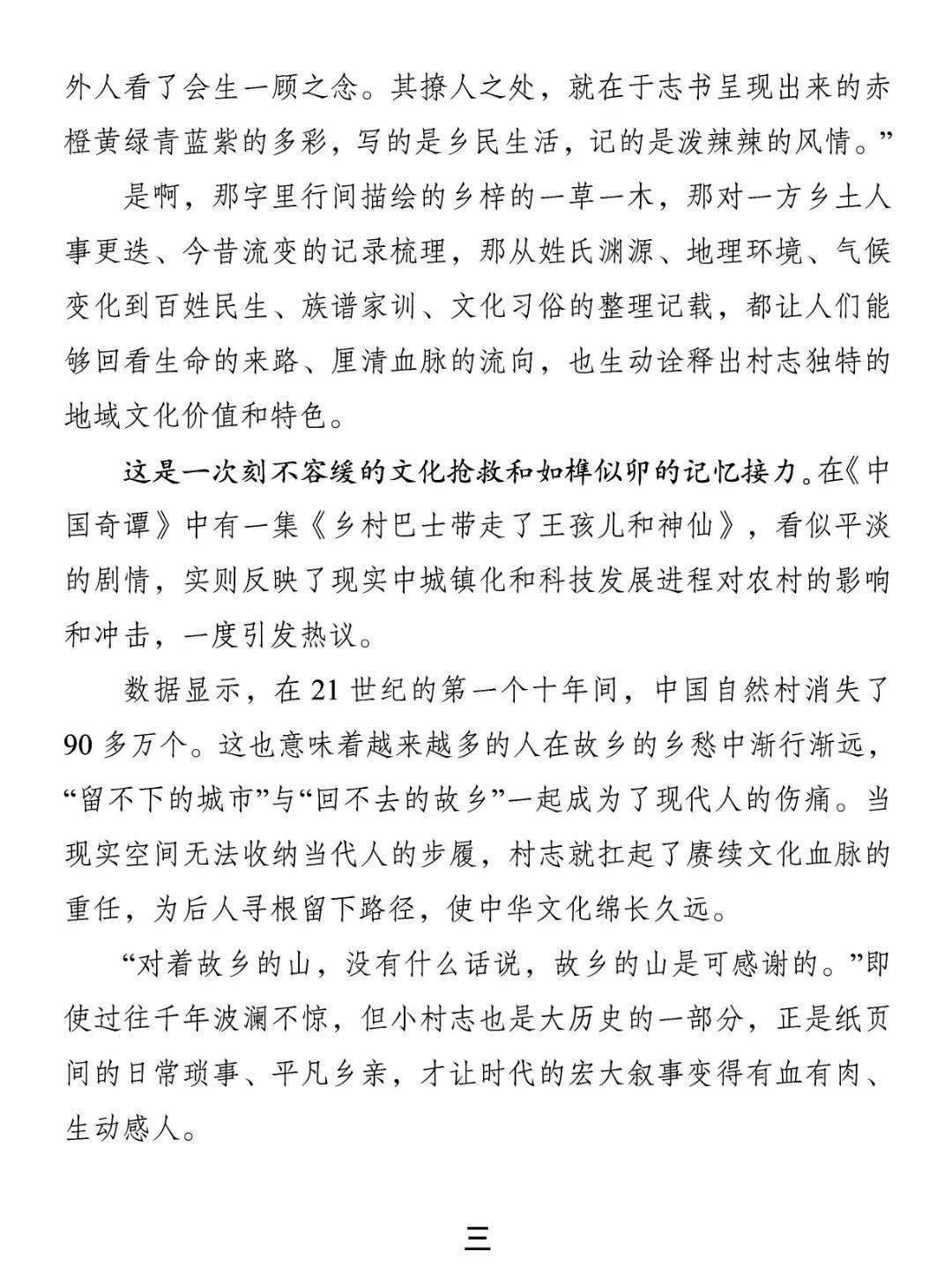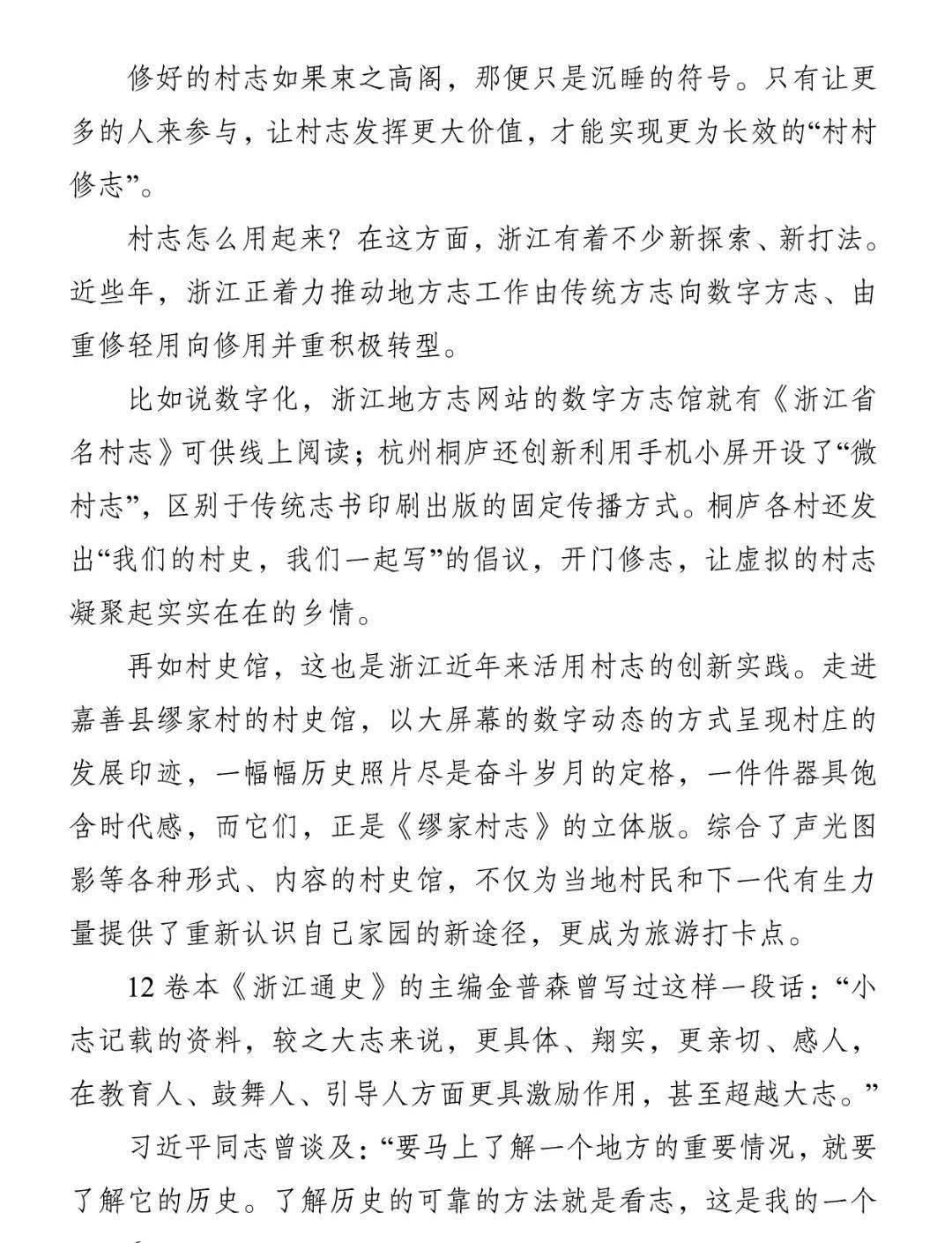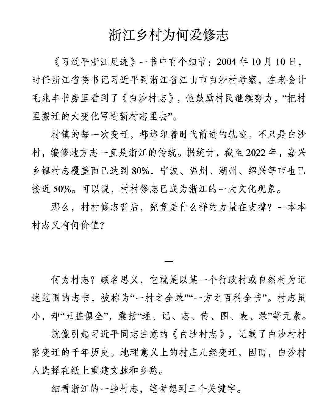 编者按:乡村文化、农耕文化是中华优秀传统文化的根脉所在,它们共同构成了丰富多彩的乡村文化体系,维系着中华民族最深层的集体记忆。振兴乡村必须保存好、挖掘好乡村文化、农耕文化,修志则是保存和挖掘乡村文化、农耕文化极为重要的途径。中共中央办公厅、国务院办公厅印发的《“十四五”文化发展规划》提出:“加强农耕文化保护传承,支持建设村史馆,修编村史、村志,开展村情教育。”乡镇(街道)志、村(社区)志是省、市、县三级志书的延伸和补充,是反映各乡镇(街道)、村庄历史变迁和发展成就,赓续乡村文化血脉的重要载体。2023年5月1日,浙江省委宣传部主办的“浙江宣传”微信公众号发布《浙江乡村为何爱修志》一文,从编修村志的意义、编修村志的必要性、如何让村志发挥更大价值3个方面介绍了浙江在村志编修方面的经验做法,对我们进一步提升思想认识,充分调动社会各方面积极性,做好全省正在开展的乡镇(街道)、村(社区)志编修及利用,提供了很好借鉴。现全文转载如下,供参阅。