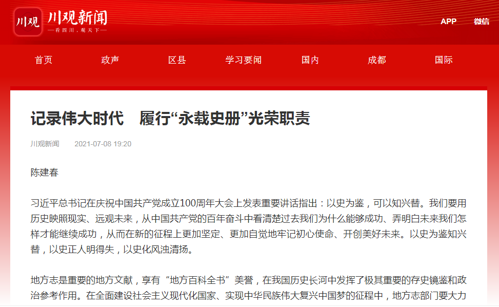 地方志是重要的地方文献,享有“地方百科全书”美誉,在我国历史长河中发挥了极其重要的存史镜鉴和政治参考作用。在全面建设社会主义现代化国家、实现中华民族伟大复兴中国梦的征程中,地方志部门要大力弘扬伟大建党精神,赓续红色血脉,传承红色基因,坚持以习近平新时代中国特色社会主义思想为指导,坚持“为中心大局服务、为经济社会发展服务、为人民群众服务”的理念,充分发挥好“存史、育人、资政”的职能职责。