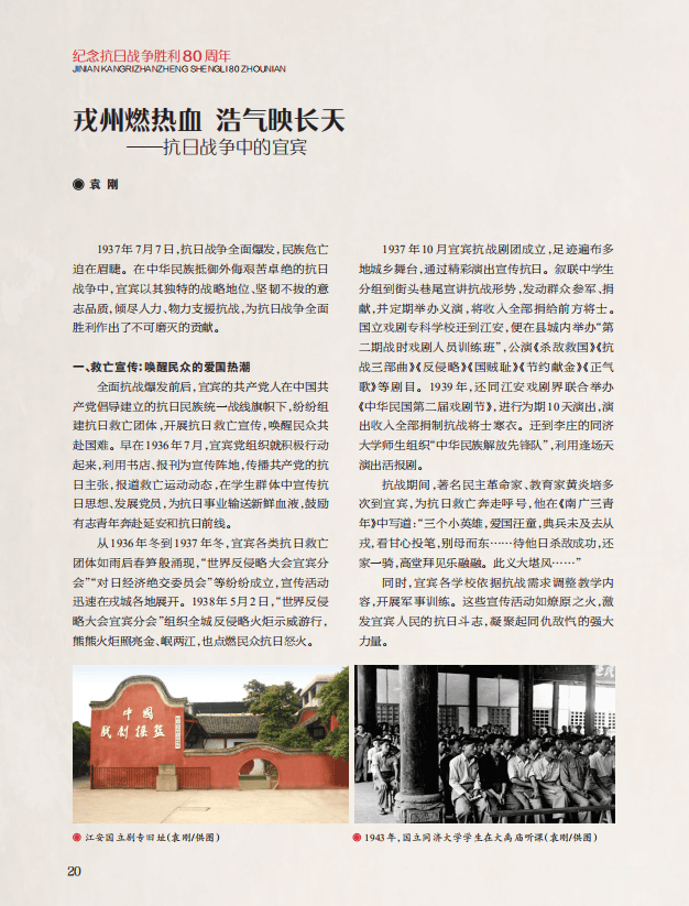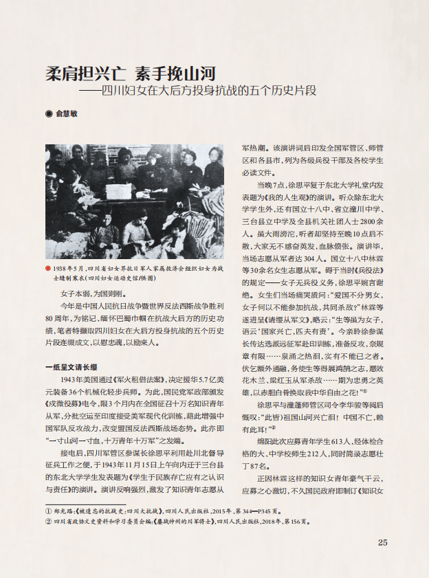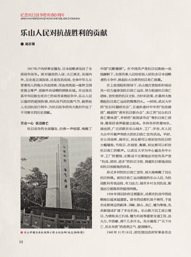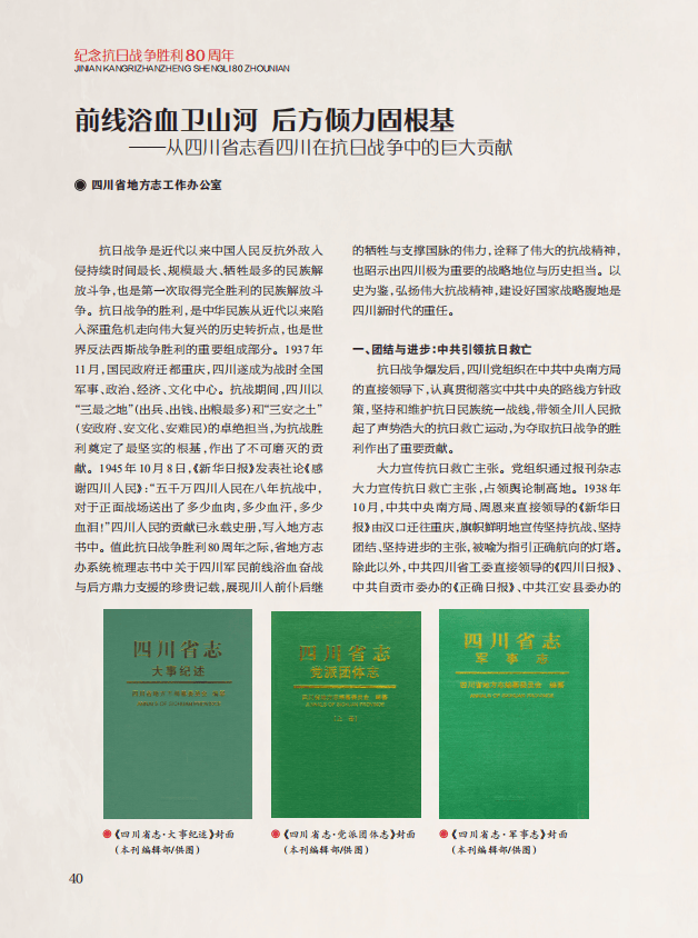 “纪念抗日战争胜利80周年”为2025年特设专栏。2025年是中国人民抗日战争暨世界反法西斯战争胜利80周年。为铭记历史,弘扬伟大的爱国主义精神、伟大抗战精神,从中汲取开创未来的精神和力量,本期特开设“纪念抗日战争胜利80周年”专栏。专栏刊发《抗战时期自贡盐业的“增产加运”》《乐山人民对抗战胜利的贡献》《戎州燃热血浩气映长天——抗日战争中的宜宾》《柔肩担兴亡素手挽山河——四川妇女在大后方投身抗战的五个历史片段》《音乐家沙梅抗日救亡的历史功绩》《前线浴血卫山河 后方倾力固根基——从四川省志看四川在抗日战争中的巨大贡献》6篇文章。从不同角度讲述在那段艰难的岁月里,作为抗战大后方的四川,无惧敌人惨无人道的大轰炸,以全省之人力、物力、财力支援全国抗战。在战场上浴血奋战、保家卫国,在大后方坚忍不屈、慷慨奉献。无论是物质支援还是精神贡献,都体现了川人的坚韧不屈和担当奉献。通过回顾这些历史事件,讲述其背后的故事,讴歌川军抗日的悲壮和惨烈,展示四川人民在反法西斯战争中的英雄业绩,彰显伟大的抗战精神,凝聚团结奋进的力量。