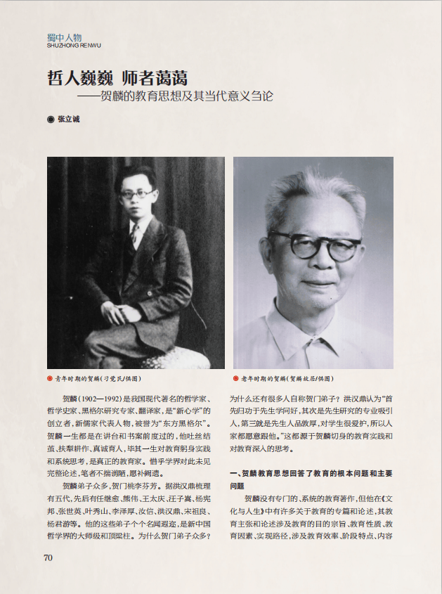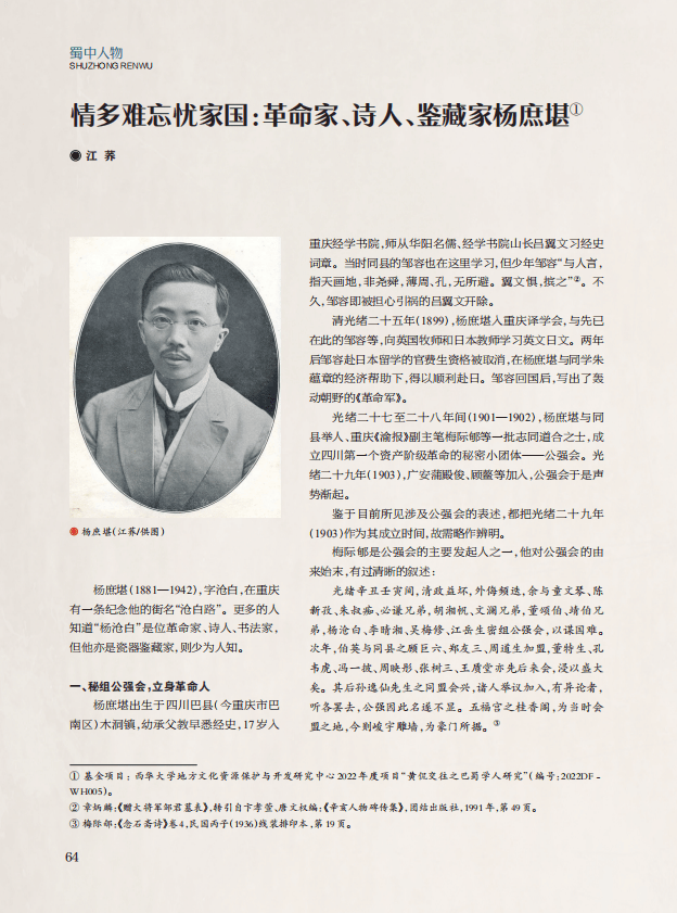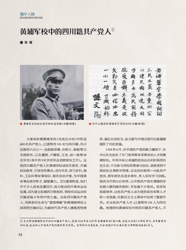 “蜀中人物”栏目刊发3篇文章。《黄埔军校中的四川籍共产党人》一文,立足史实,系统梳理了大革命时期黄埔军校(含武汉分校)中的四川籍共产党人的数量、产生的原因、开展的主要工作以及对后续革命工作的重要影响。《情多难忘忧家国:革命家、诗人、鉴藏家杨庶堪》一文,梳理了重庆籍革命家、诗人、鉴藏家杨庶堪生平事迹及其文化、政治活动,并将杨庶堪生平事迹置于“诗人革命家”的整体视野下加以考察,为理解杨庶堪提供了视角和方法。《哲人巍巍师者蔼蔼——贺麟的教育思想及其当代意义刍论》一文,对贺麟教育思想的起源、主要内容、当代价值以及对当今教育改革发展的现实意义作了研究,并提出了独到见解。几篇文章尊重客观历史事实,做到史论结合,论从史出。