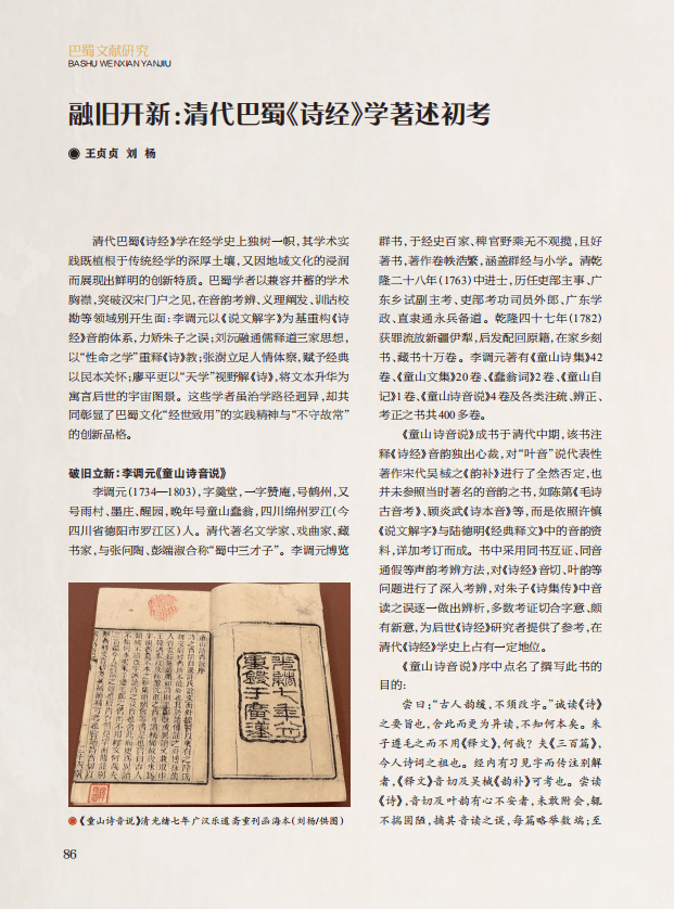 “巴蜀文献研究”栏目刊发3篇文章。《唐宋巴蜀医药文献初考》一文,梳理唐宋巴蜀重要医药文献的学术脉络、版本流变及历史影响,以期为中国古代医学史研究提供地域视角的阐述与解读。《易学在蜀,于兹为盛——宋代巴蜀易论文献纵论》一文,梳理了巴蜀易论文献的种类及其与经学、文学及政治思想领域的互动,论述了巴蜀易论文献的价值与意义。《融旧开新:清代巴蜀〈诗经学著述初考〉》,主要阐述了清代巴蜀《诗经》学在经学史上的独特地位,其既植根传统经学,又因地域文化浸润展现创新特质,具体介绍了不同学者的研究特点及代表性著作,为《诗经》研究提供了丰富样本。