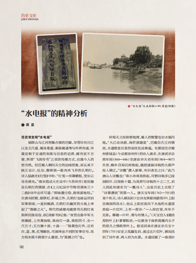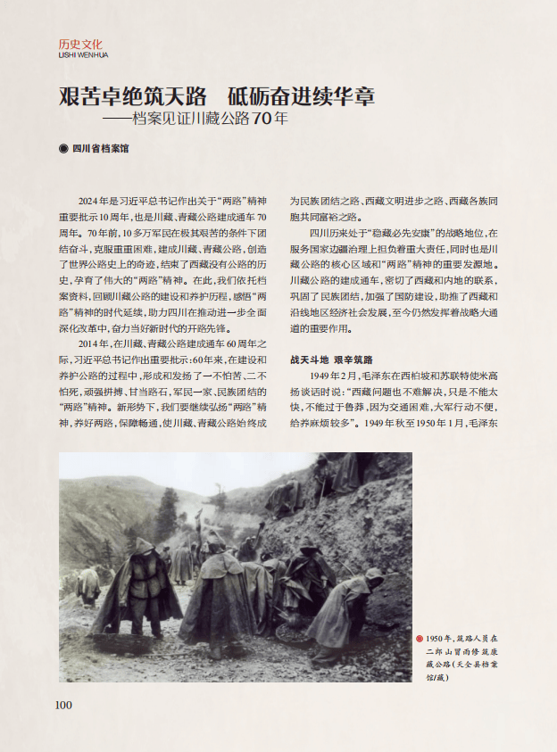 “历史文化”栏目刊发3篇文章。《“水电报”的精神分析》围绕“水电报”这一巴蜀地区特有的信息传播方式展开,阐述了其起源、发展及历史意义。《艰苦卓绝筑天路砥砺奋进续华章——档案见证川藏公路70年》一文,立足于川藏公路的修筑背景讲述修建川藏公路的艰苦历程、养护情况以及川藏公路沿线地区在“两路”精神的激励与鼓舞下发生的巨大变化。《成都饮食文化中民族元素与地域元素的交融典型》一文,以成都回族餐饮为研究对象,旨在探讨民族餐饮文化与地域餐饮文化的融合发展问题。几篇文章选题独特,史料丰富,内容翔实,见解独到。