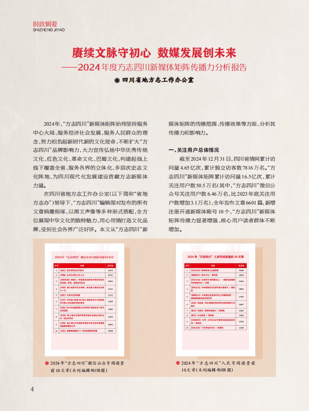 “时政辑要”栏目,刊发《赓续文脉守初心 数媒发展创未来——2024年度方志四川新媒体矩阵传播力分析报告》一文。文章从关注用户总体情况、文章阅读量分类分析、音视频影响力分析、亮点及成绩、留言分析五个方面,总结2024年“方志四川”新媒体矩阵坚持服务中心大局、服务经济社会发展、服务人民群众的理念,通过微信公众号、澎湃号、喜马拉雅电台、抖音号等多平台协同发力,在内容传播上聚焦红色文化、革命文化、传统文化及巴蜀文化,凭借优质内容、紧扣时代节点的策划、多方合作及品牌建设,实现了传播力与影响力的显著提升,为四川地方志事业高质量发展贡献了新媒体力量。