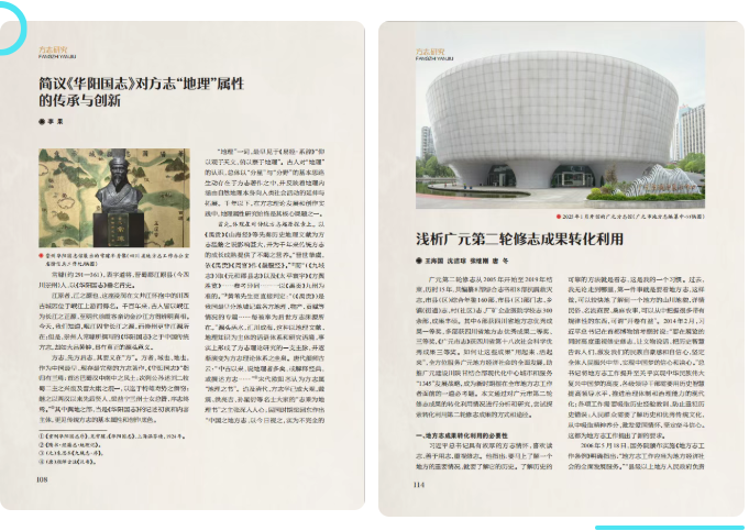 “方志研究”栏目刊发《简议〈华阳国志〉对方志“地理”属性的传承与创新》《浅析广元第二轮修志成果转化利用》2篇文章。前文聚焦晋代常璩所著《华阳国志》,围绕其对方志“地理”属性的传承与创新展开深入论述,凸显该书在中国传统方志发展史上的源头性与里程碑意义;后文对广元第二轮修志成果转化利用的必要性、存在短板与不足、对策和途径等进行分析研究,对进一步加强第二轮修志成果转化利用具有借鉴意义。