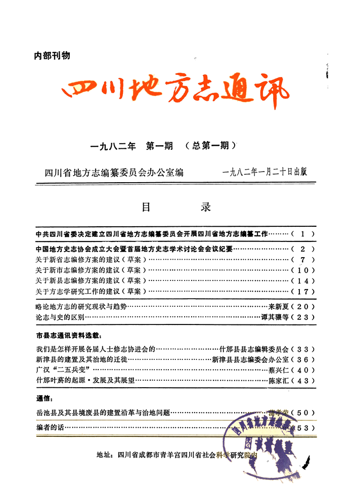 《四川地方志通讯》1982年第1期(总第1期) 来源:四川省地方志工作办公室 发布时间:2021-06-16 17:21:53 浏览次数: 次 【字体:小 大】 《四川地方志通讯》1982年第1期(总第1期) 来源: 四川省地方志工作办公室 终审:何晓波 分享到: 关闭本页 【打印正文】