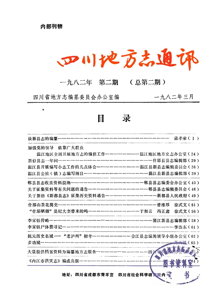 《四川地方志通讯》1982年第2期(总第2期) 来源:四川省地方志工作办公室 发布时间:2021-06-16 17:23:12 浏览次数: 次 【字体:小 大】 《四川地方志通讯》1982年第2期(总第2期) 来源: 四川省地方志工作办公室 终审:何晓波 分享到: 关闭本页 【打印正文】