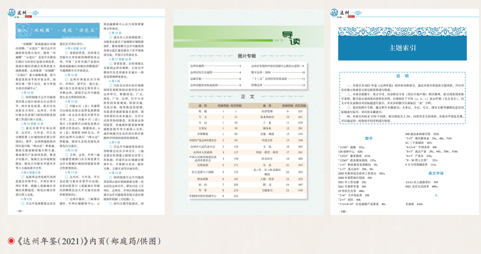 (三)大事记。按时间顺序记述重大事项,有其特定的体例要求,一般来讲表现形式相对固定。中国年鉴研究会会长王守亚在“年鉴大讲堂”上曾讲到专题大事记设置问题。受此启发,我们在《达州年鉴(2021)》大事记类目,设置了“融入双城圈·建设示范区”专题大事记分目。