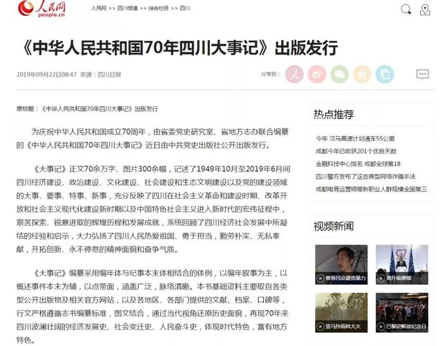 2019年9月22日,人民网转载当日《四川日报》报道:《中华人民共和国70年四川大事记》出版发行