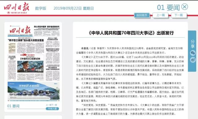 2019年9月22日,《四川日报》头版报道:《中华人民共和国70年四川大事记》出版发行