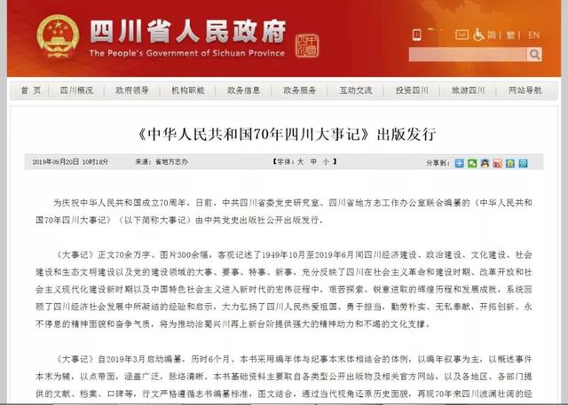 2019年9月20日,四川省人民政府网报道:《中华人民共和国70年四川大事记》出版发行