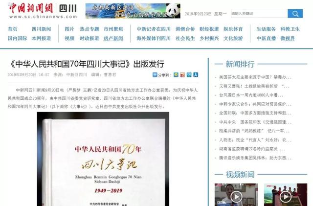 2019年9月20日,中国新闻网报道:《中华人民共和国70年四川大事记》出版发行