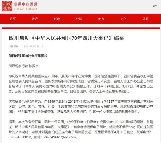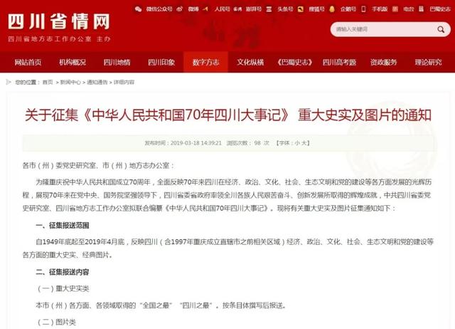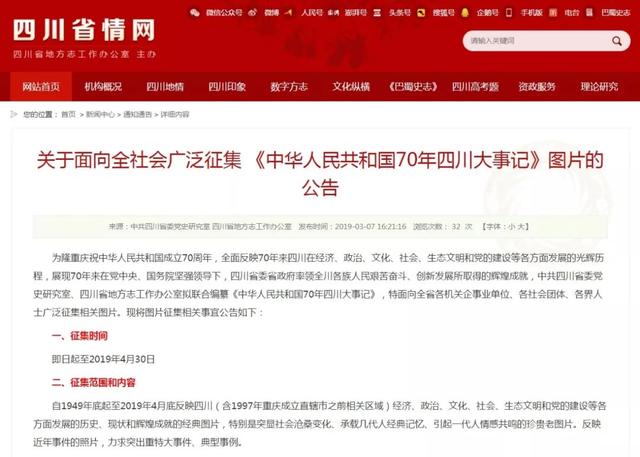 2019年3月7日,省委党史研究室、省地方志办联合发出《关于面向全社会广泛征集《中华人民共和国70年四川大事记》图片的公告》