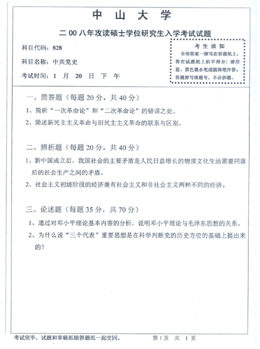 中山大学2008年攻读硕士学位研究生入学考试试题(中共党史)(图片来自网络)