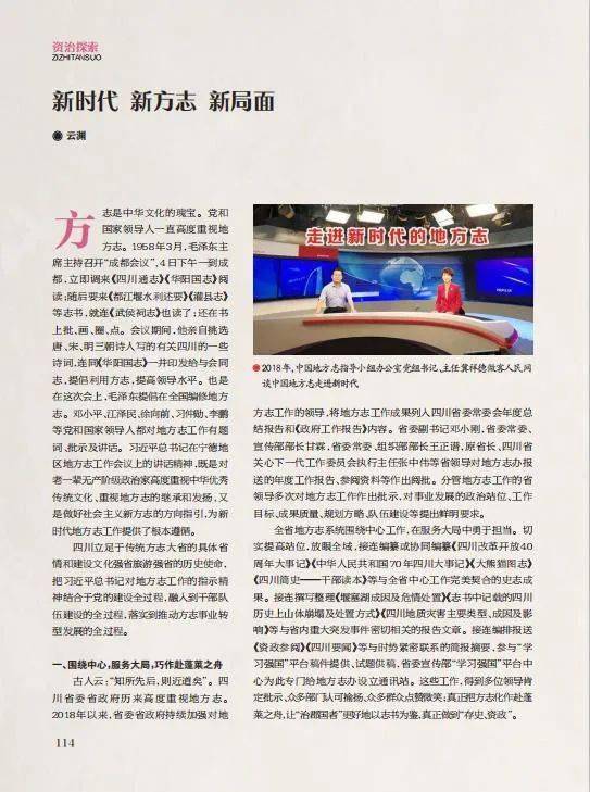 全省地方志系统围绕中心工作,在服务大局中勇于担当。切实提高站位,放眼全域,接连编纂或协同编纂《四川改革开放40周年大事记》《中华人民共和国70 年四川大事记》《大熊猫图志》《四川简史——干部读本》等与全省中心工作完美契合的史志成 果。接连撰写整理《堰塞湖成因及危情处置》《志书中记载的四川历史上山体崩塌及处置方式》《四川地质灾害主要类型、成因及影响》等与省内重大突发事件密切相关的报告文章。接连编排报送《资政参阅》《四川要闻》等与时势紧密联系的简报摘要,参与“学习强国”平台稿件提供、试题供稿,省委宣传部“学习强国”平台中心为此专门给地方志办设立通讯站。这些工作,得到多位领导肯定批示、众多部门认可揄扬、众多群众点赞微笑;真正把方志化作赴蓬莱之舟,让“治郡国者”更好地以志书为鉴,真正做到“存史、资政”。