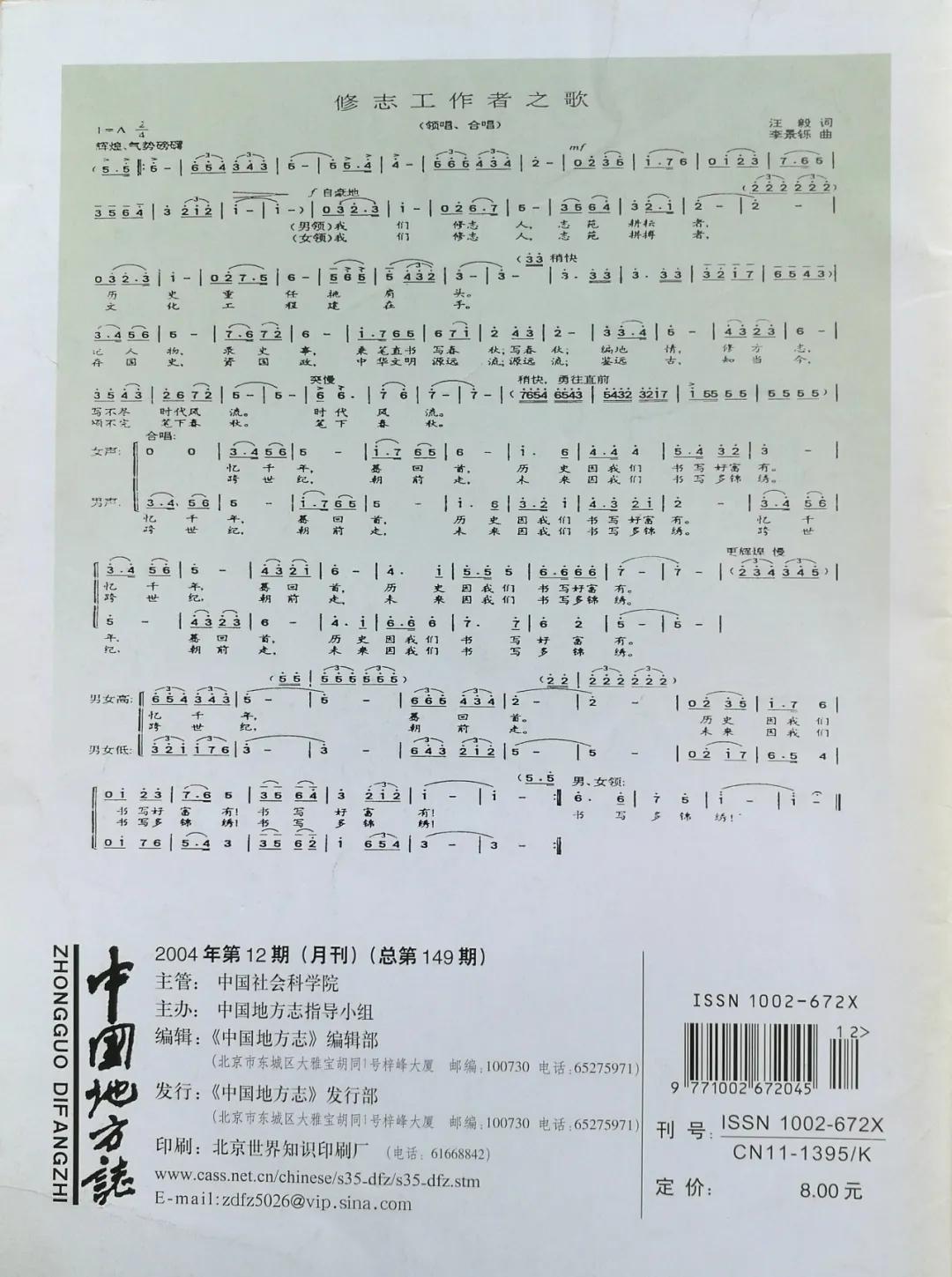 2004年第12期《中国地方志》再次发表《修志工作者之歌》