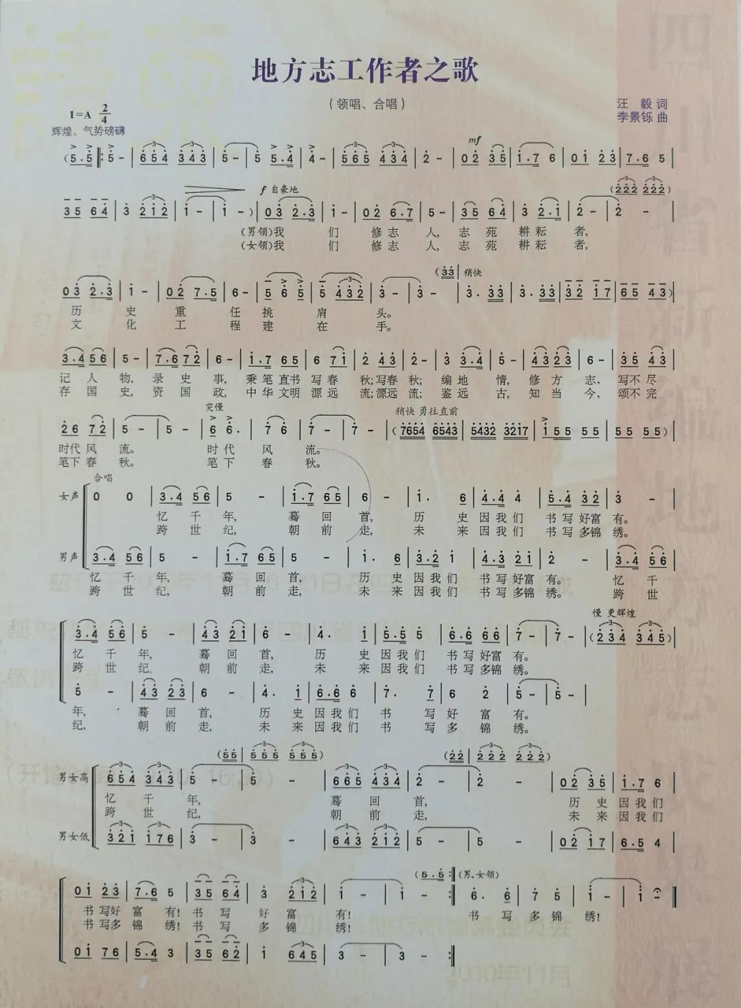 1.《地方志工作者之歌》创作于2000年,汪毅词,李景烁曲,曾发表于《中国地方志》《巴蜀史志》《上海志鉴》《广西地方志》《广东史志》《黑龙江史志》《内蒙古地方志》等杂志,在方志界传唱。