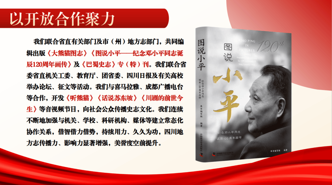 (三)以开放合作聚力。开放合作是提升方志文化影响力的放大器。众人拾柴火焰高。我们充分认识到,地方志是“一方之全史”,外延广泛、内涵丰富,做好地方志工作,仅限于地方志系统的力量是不够的,需全社会共同参与,形成强大合力。我们秉持开放理念,敞开大门,与社会各界加强合作,聚智聚力推动合作共赢。我们与重庆市地方志办、西华师范大学、内江师范学院共建巴蜀方志文化研究中心、方志研究中心,提升学术理论水平。我们与四川日报报业集团、人民网四川频道等签署战略合作协议,并与学习强国四川学习平台密切联系,在文化传播协作、平台资源共享、创新技术应用等方面加强合作。适应人工智能发展需要,我们与四川日报报业集团共同建设的省情语料库“若水”,入选2025中国新媒体大会案例和四川省2025年“数据要素×”典型案例。我们联合省直有关部门及市(州)地方志部门,共同编辑出版《大熊猫图志》《图说小平——纪念邓小平同志诞辰120周年画传》及《巴蜀史志》专(特)刊。我们联合省委省直机关工委、教育厅、团省委、四川日报及有关高校举办论坛、征文等活动。我们与喜马拉雅、成都广播电台等合作,开发《听熊猫》《话说苏东坡》《川剧的前世今生》等音视频节目,向社会公众传播史志文化。我们与机关、学校、科研机构、媒体等建立常态化协作关系,借智借力借势,四川地方志传播力、影响力显著增强,美誉度空前提升。