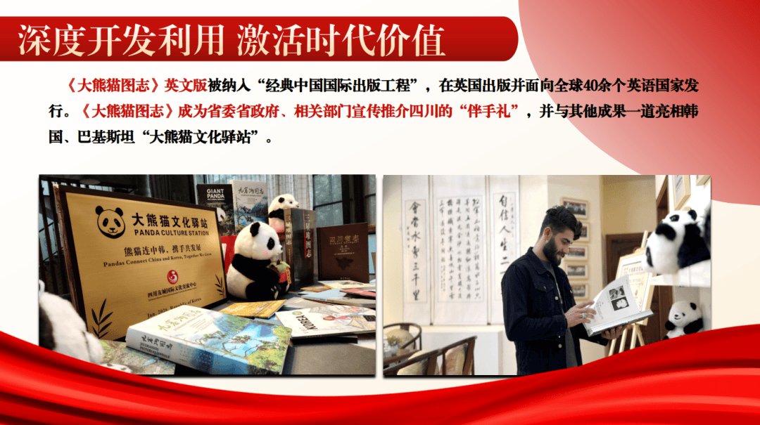 (四)深度开发利用,激活时代价值。深挖方志“沉睡富矿”,赋予地方志新的时代内涵、表现形式和生命活力。我们围绕服务文化强省旅游强省建设,推进《蜀道图志》《中国川菜图志》《四川地理标志产品图志》《黄龙图志》等编纂。《大熊猫图志》英文版被纳入“经典中国国际出版工程”,在英国出版并面向全球40余个英语国家发行。《大熊猫图志》成为省委省政府、相关部门宣传推介四川的“伴手礼”,并与其他成果一道亮相韩国、巴基斯坦“大熊猫文化驿站”。成都《锦城之舟——成都公共交通车辆影像志》入选第二届联合国全球可持续交通大会。一批底蕴深厚、“川味十足”的方志文化产品走出国门,成为中国文化“走出去”最生动最鲜活的案例;我们围绕丰富巴蜀文库,出版《四川当代史》《四川简史》《巴蜀历史文化十讲》《蜀韵纪事》系列丛书及《巴蜀史志》“四川历史名人”“聚焦三星堆”“非物质文化遗产”“三苏文化”“巴蜀石窟文化”等专(特)刊,讲好四川故事、宣传四川人文风情;我们围绕抓好《四川年鉴》等转化运用,编纂《四川年鉴》简本、《四川印记》等年鉴衍生文化产品,创新推出《四川历史文化览读》,服务省两会代表委员。“十四五”时期,全省各地围绕本地特色文化、景点、产品、技艺等,编纂出版《典籍里的成都》《乐山美食图志》《甘孜山水志》《巴中文旅康养图志》等398部接地气、受欢迎的史志成果,服务当地经济社会发展。