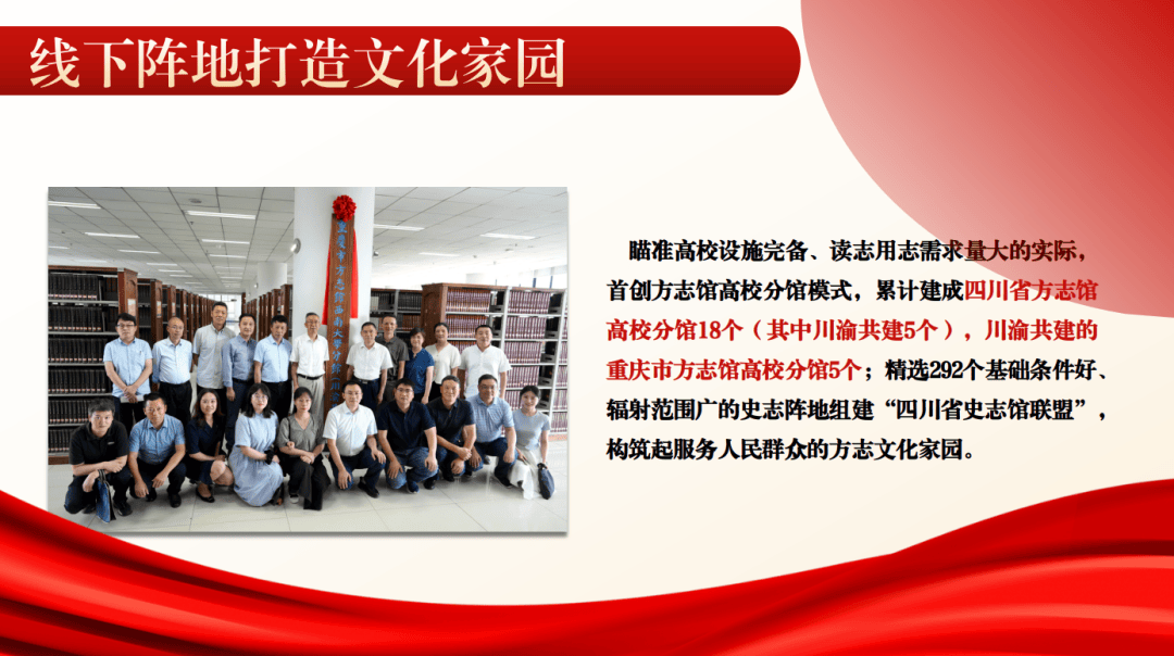 (二)线下阵地打造文化家园。我们树牢“民有所需、志有所为”导向,高度重视实体阵地建设,在川渝两地建成史志文化阵地2723个〔四川方志文化交流中心1个,方志馆79个,微方志馆168个,史志阅览室1610个,方志文化宣传基地1个,图书馆史志专柜(架)201个,四川省方志馆高校分馆18个(其中川渝共建5个),川渝共建的重庆市方志馆高校分馆5个,乡(镇、街道)情馆、村(社区)史馆640个〕,打通方志服务人民群众“最后一公里”。其中,瞄准高校设施完备、读志用志需求量大的实际,首创方志馆高校分馆模式,累计建成四川省方志馆高校分馆18个(其中川渝共建5个),川渝共建的重庆市方志馆高校分馆5个;精选292个基础条件好、辐射范围广的史志阵地组建“四川省史志馆联盟”,构筑起服务人民群众的方志文化家园。