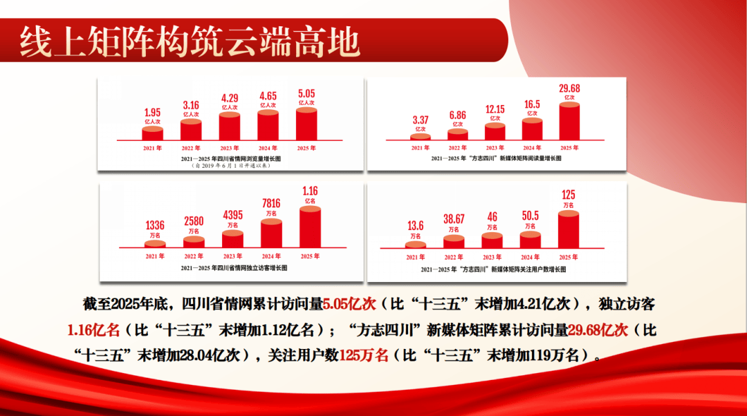 (一)线上矩阵构筑云端高地。我们树牢互联网思维,充分认识到新媒体在文化传播中的重要作用,提出“必用、敢用、善用”新媒体理念。自觉站在传承弘扬中华优秀传统文化、宣传推介四川省情地情和巴蜀文化的高度,将“四川省地方志”网改版升级为“四川省情网”,扩容提质《巴蜀史志》期刊,陆续建成“12文章号10视频平台1网1台1刊1店1馆1云1博”“方志四川”新媒体矩阵,形成中华优秀传统文化、革命文化、巴蜀文化立体传播格局,以质量上乘、内涵丰富、形式新颖的文章吸引大批“铁杆粉丝”。截至2025年底,四川省情网累计访问量5.05亿次(比“十三五”末增加4.21亿次),独立访客1.16亿名(比“十三五”末增加1.12亿名);“方志四川”新媒体矩阵累计访问量29.68亿次(比“十三五”末增加28.04亿次),关注用户数125万名(比“十三五”末增加119万名)。“十四五”时期,“方志四川”新媒体矩阵发布的文章有313篇阅读量在50万以上(32篇阅读量1000万以上,其中阅读量4000万以上3篇、5000万以上2篇);发布的视频浏览量500万以上的16条(其中1000万以上6条)。“方志四川”多次入选澎湃政务号年度传播案例,跻身“顶端政务号排行榜”等全国及全省政务传播影响力榜单,成为传播力强、影响力广、公信力高的历史文化宣传平台。《巴蜀史志》期刊多次亮相北京国际图书博览会,多次在全国会议及四川省期刊协会年会上交流办刊经验。“成都方志”微信公众号粉丝134万、抖音号粉丝148万。自贡方志、志中阿坝等新媒体平台影响巨大、传播广泛。