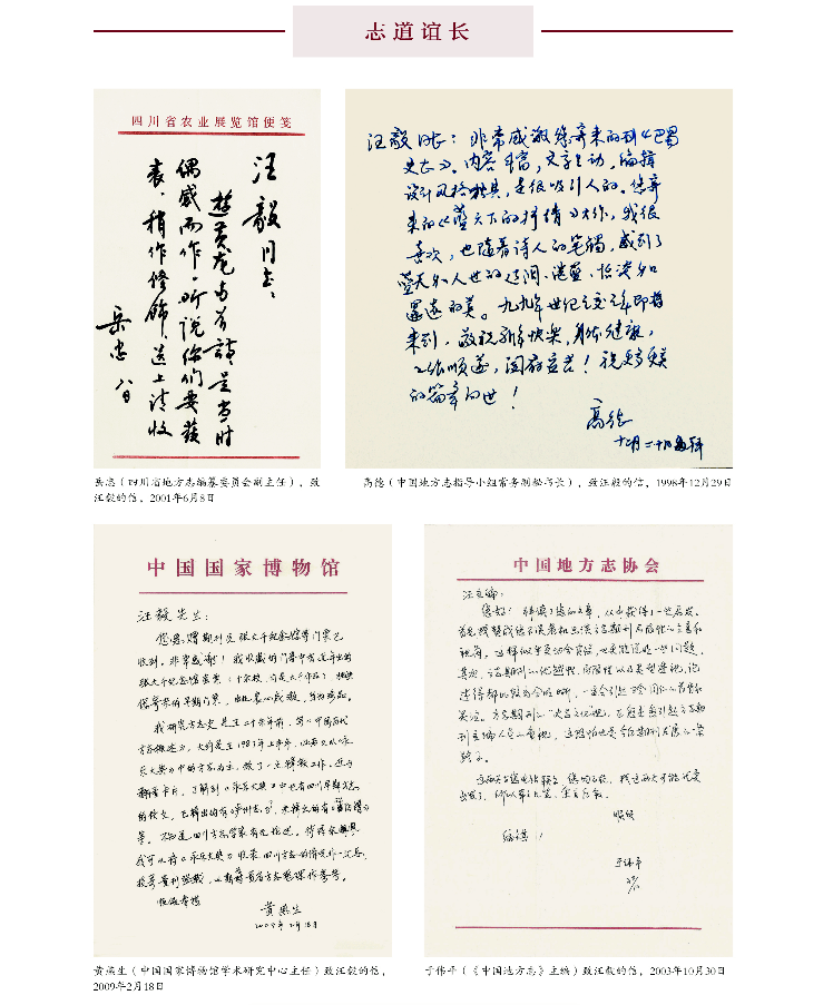 如果说图录是《我与地方志二十年》之一翼,那么“著述”的文字部分便是另一翼了。著述部分,记录了我与地方志20年的多元思考和实践总结。这些思考和总结,具有面较广泛的特征,虽不乏时代烙印,但却是一份渐进式的记录,无疑可补遗四川方志发展史之一二。著述分《方志影视》《志书评考》《志书审读》《方志漫谈》《史志文丛》(不含汤绍恩、安岳石刻相关内容与1996年之前所撰写篇什)、《方志诗词》《方志馆建设》七个单元,约30万字,多发表于全国和省级报刊,并形成相对系列。这些文字,包括方志影视作品、志书评介,志书审读记录、方志文化思考,史志文丛记录,方志诗词创作,方志馆建设讨论,旨在体现我“志以载道,以启未来”的思考和情怀,与扉页所书法的“志”“道”二字相呼应,传递与地方志20年的那一段满满记忆的信息。