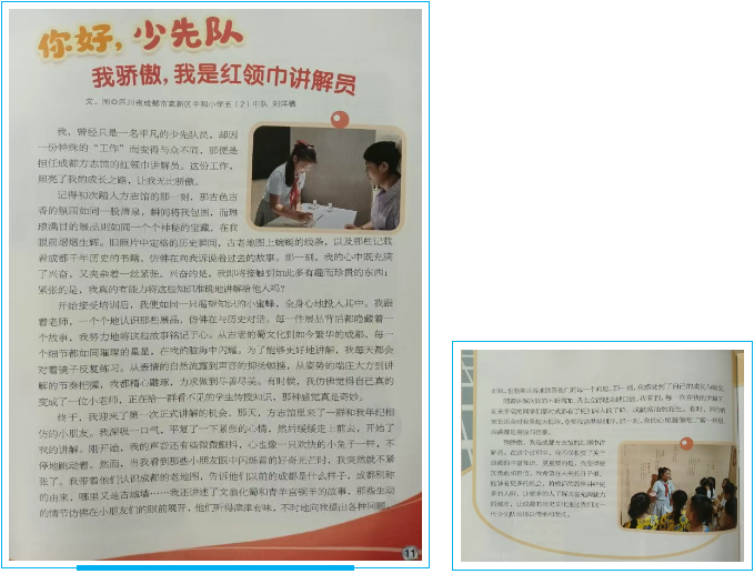 近日,四川省少先队队刊《少年时代》刊登了成都方志馆红领巾讲解员、成都高新区2025年度红领巾小史官、成都高新区中和小学五(2)中队刘洋栖同学的《我骄傲,我是红领巾讲解员》一文。刘洋栖同学在文中分享了自己在成都方志馆担任红领巾讲解员的成长经历与深刻感悟,生动展现了红领巾讲解员传播城市文化的风采。“方志四川”特转载于后,与广大读者一同感受蓉城少年对家乡文化传播的热忱与自豪。