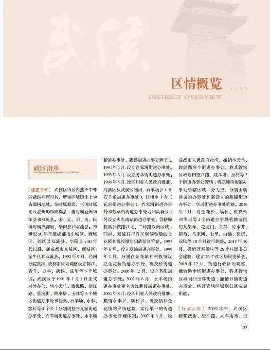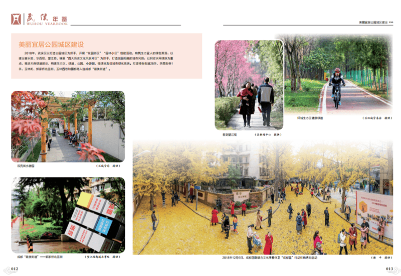 一是前彩选取武侯区年度大事要闻为主题组织图片,突出年度特色和工作亮点。二是前彩在排版上形式力求多样、活泼,既反映特色,又接“地气”。三是专门编制区划地图,并根据变化情况及时更新。四是设置“数字武侯”,直观呈现人口、财政收入、固定资产投资等读者比较关注的50余项重要数据,便于读者查阅和对比往年数据。