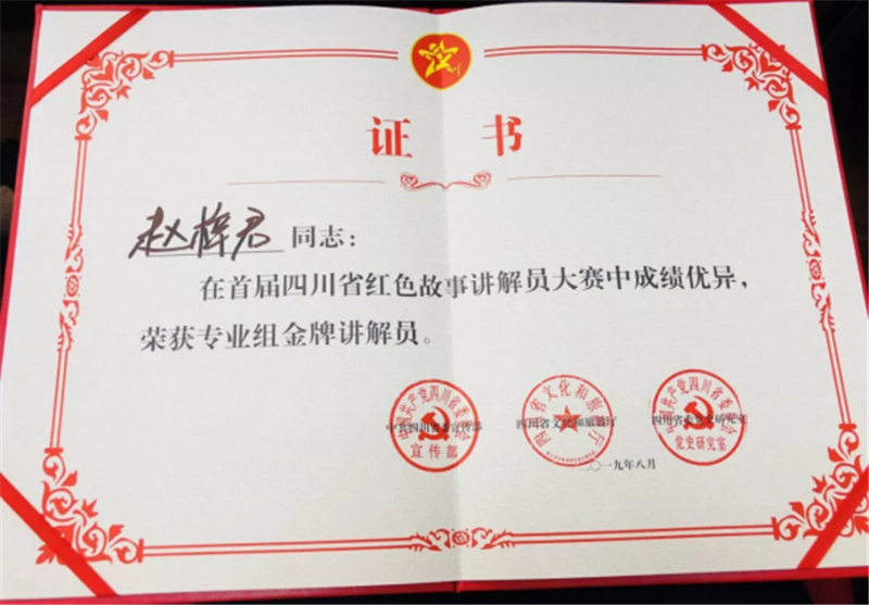 8月22日至24日,四川省红色故事讲解员大赛在广安市小平干部学院举行。绵阳梓潼“两弹城”讲解员赵梓君获得“四川省红色故事讲解员大赛金牌讲解员”称号及荣誉证书,展示了“两弹城”红色旅游讲解员队伍的水平和风采。