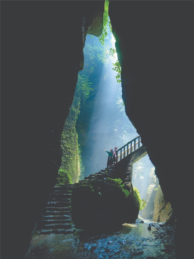 采访团兵分两组,从天上地下探秘古僰人的“桃源”。航拍组在寿山湖升起无人机,沟谷溪流、飞瀑湖潭、洞穴奇石等神奇自然风光一一进入视野。