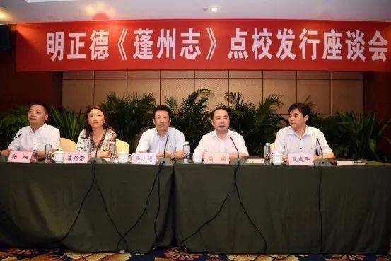 2016年7月20日,蓬安县召开明正德《蓬州志》点校发行座谈会。主席台上就坐的是(从左至右)县政府副县长杨炯、县政府县长崔竹君、省地方志办主任马小彬、县委书记蒲国、南充市地方志办主任夏建平