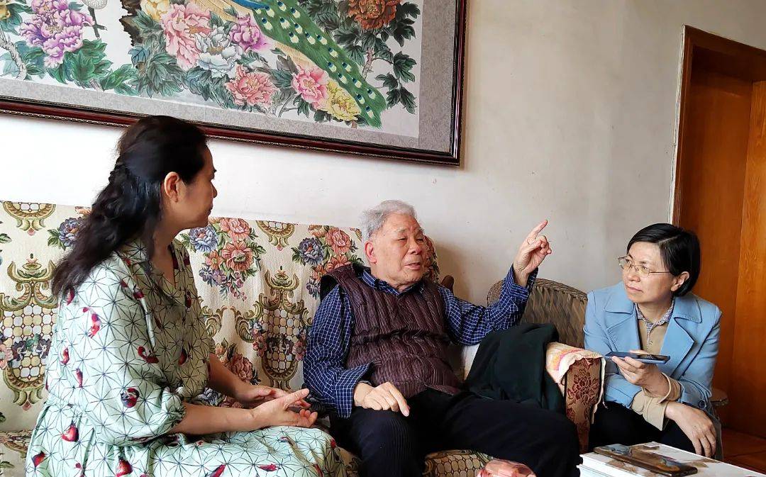 2024年4月2日,原国家计委三线建设调整办公室主任、中国三线建设研究会名誉会长王春才向四川省地方志办党组成员、副主任江红英(右一)和赵行(左一)讲述三线往事(朱艳林 摄)