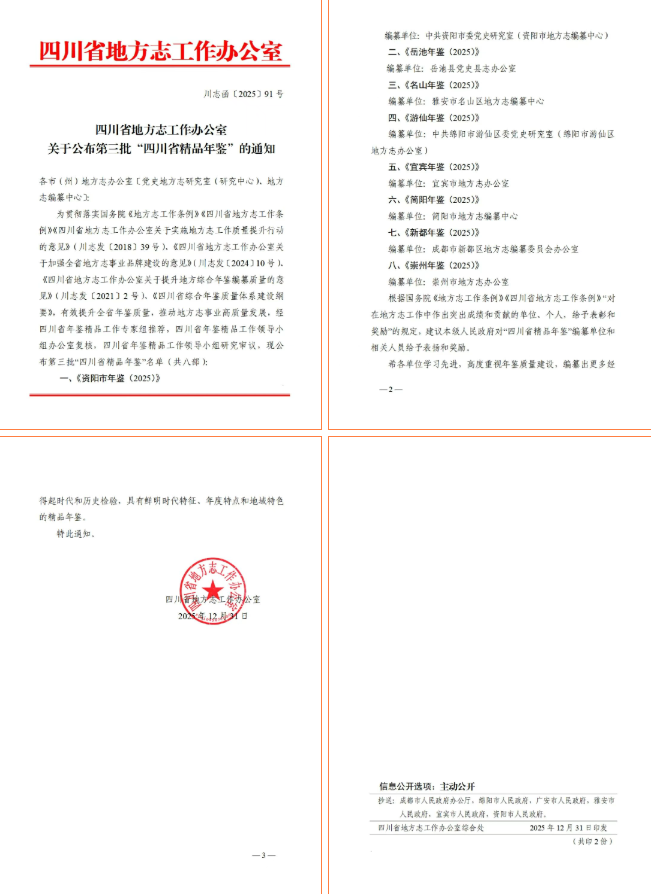 《四川省地方志工作办公室关于公布第三批“四川省精品年鉴”的通知》(川志函〔2025〕91号)