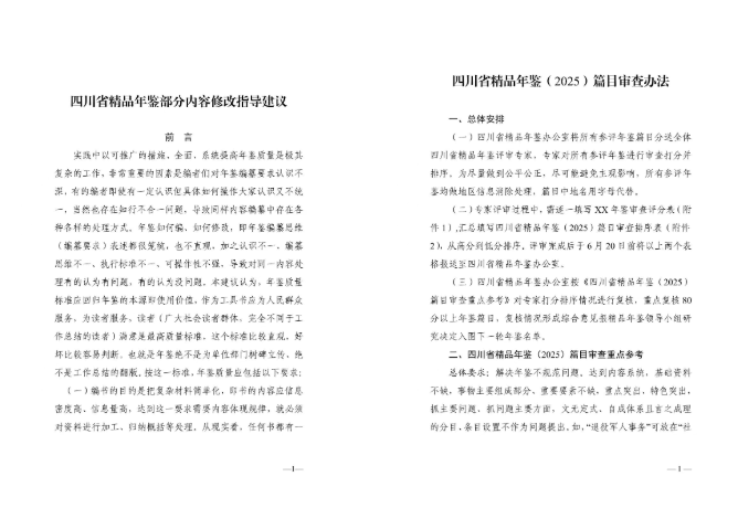 左图:《四川省精品年鉴部分内容修改指导建议》;右图:《四川省精品年鉴(2025)篇目审查办法》。