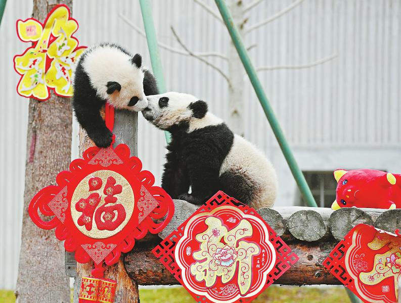 ①新春里,在卧龙神树坪基地,两只大熊猫在玩耍。本报记者 何海洋 摄 (资料图片)