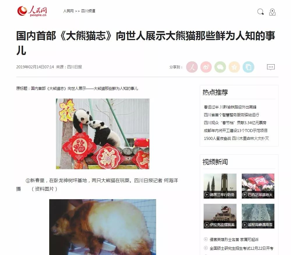 2月14日,《四川日报》以《国内首部〈大熊猫志〉向世人展示——大熊猫那些鲜为人知的事儿》为题,解读大熊猫神秘身世、物种特征、分布规律以及保护、拯救、研究大熊猫的历程,人民网、光明网、国际在线、中国社会科学网、凤凰网等主流媒体予以转载。