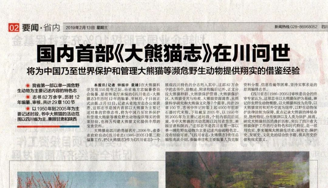 2月13日《四川日报》第2版头条报道:国内首部《大熊猫志》在川问世