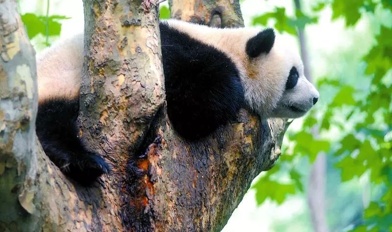 成都大熊猫繁育研究基地内的大熊猫在树上玩耍(资料图片,四川日报记者 衡昌辉 摄,来源:2018年8月21日《四川日报》)