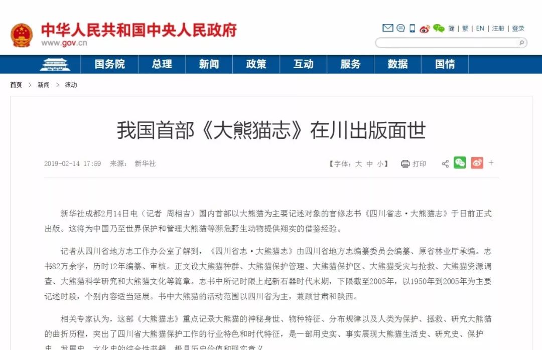 2019年2月15日,《四川省志·大熊猫志》出版发行被列为新华社封面要闻,新华社在《早知天下事》“国内要闻”板块,向全世界播报“国内首部以大熊猫为主要记述对象的官修志书《四川省志·大熊猫志》正式出版”。